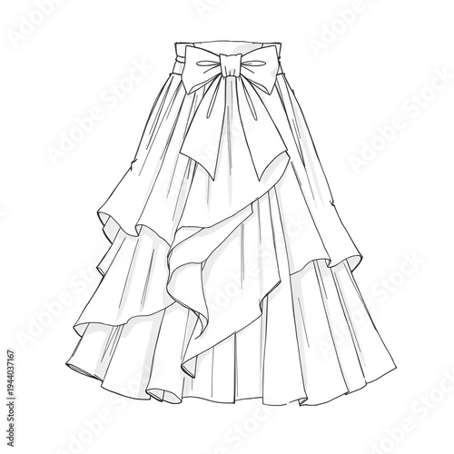 Layered ruffle skirt illustration, asymmetrical bow waistband design, pleated full skirt drawing, fashion flat sketch, technical garment artwork, apparel construction professional