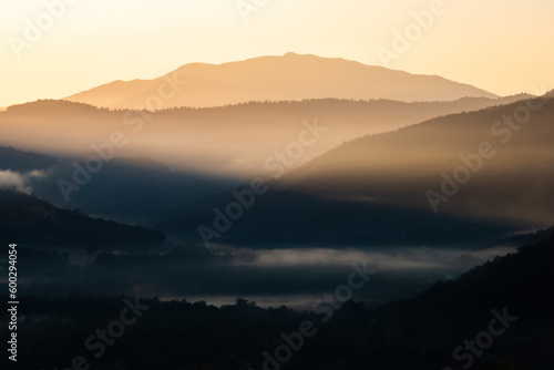 mountain, landscape, sunset, sky, nature, sunrise, fog, mountain, sun, morning, mist, hill, view, cloud, forest, vale, dawn, misty, horizon, light, silhouette, dusk, evening, travel, layer, line, distance, far