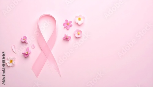 Lazo rosa de concienciación sobre fondo rosa pastel con flores pequeñas y composición minimalista
