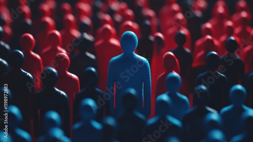 leader stands out among crowd, symbolizing motivation and career growth. blue figure represents guidance, while red figures signify teamwork and collaboration