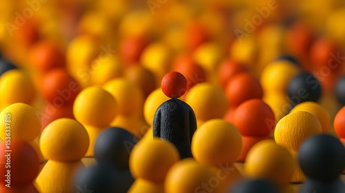 leadership, concept, leader, figure, black, red, yellow, group, crowd, standing out, different, unique, individual, individuality, bold, abstract, minimalist, wooden, toy, sphere, ball-shaped, choice, strategy, business, management, success, innovation, direction, teamwork, community, togetherness, symbol, representation, person, people, corporate, metaphor, vision, opportunity, sharpened, goal, achievement, influence, power, strength, courage, challenge, boldness, perspective