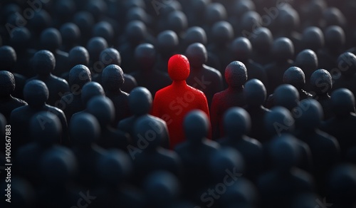 leadership, individuality, difference, crowd, abstract, figure, red, center, concept, unique, standing out, success, identity, community, selection, employment, talent, discrimination, team, people, client, audience, target, business, marketing, extraordinary, distinct, candidate, group, recruitment, skill, multiple, alone, three-dimensional, rendered, illustration, contrast, showcase, visual, abstract art, digital artwork, minimalist, representation