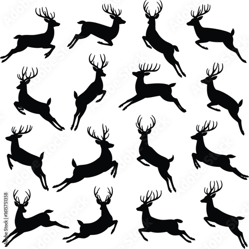 stag, cervid, silhouette, leaping, jumping, running, antler, black, white, pattern, wildlife, nature, animal