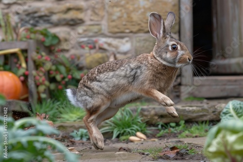 Leaping Wild Rabbit in Autumn Garden