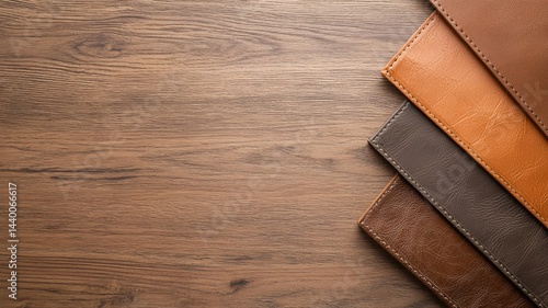 Leather Swatches on Wood Grain Background leather swatches texture material brown orange gray wood