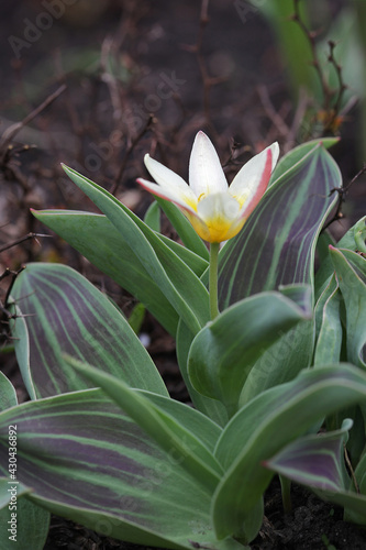 leaves and flower of Kaufman tulip, with wide stripes. Wild undersized variety with striped leaves.