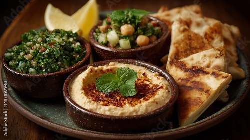 Lebanese mezze platter with hummus and tabbouleh.