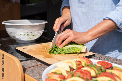 food, cooking, kitchen, chef, woman, salad, eatery, hand, vegetable, dinner, meal, people, healthy, cook, lunch, plate, lettuce, table, knife, fresh, preparation, vegan, vegetarian, motorhome, camping, cutting, tomatoes, cut