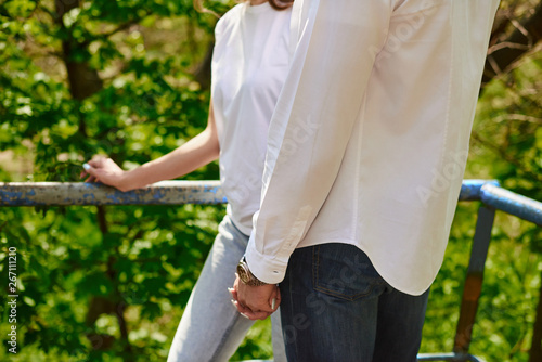 legs of young hugging couple on stairs in green park