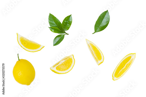 Lemon fruit, slices and green leaves isolated on white background