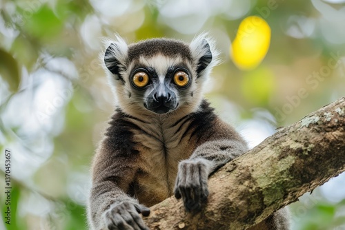 lemur, tree, tree branch, forest, wildlife, animal, daytime, nature, madagascar, eye, fur, explore, habitat, primate, tropical, environment, yellow, brown, green, sunny, observation, climbing, furry, fauna, exotic, wild, natural, peace, relaxed, curious, lush, species, ecology, biodiversity, conservation, park, outdoors, landscape, behaviour, floor, adventure, travel, encounter, observing, calmness, playful, setting, diversity