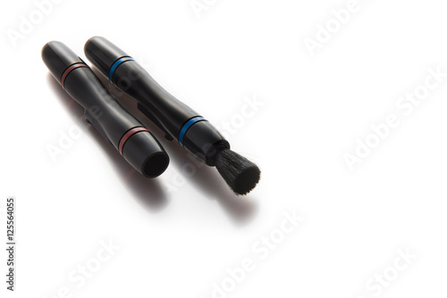 Lens pen and brush for cleaning camera and lens isolated on white background.