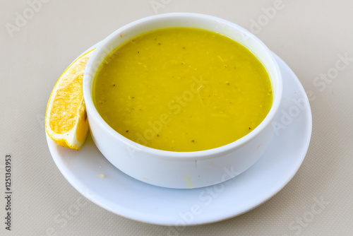 Lentil ( mercimek corbasi ) soup with melted butter and red pepper sauce. Limon ve soslu mercimek corba.