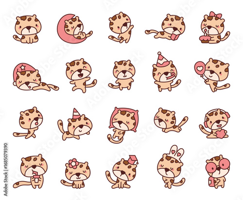 leopard, adorable, animal, cute, cartoon, character, emotion, pose, friendly, sleeping, standing, smiling, reading, holding, walking, resting, drinking, valentine, sitting, lying, book, cake, candle, birthday, party hat, balloon, nubes, love, pillow, nightcap, straw, beverage, flower, rabbit, ear, earphones, goggles, backpack, bow, smart, school, cognition, student, calm, set