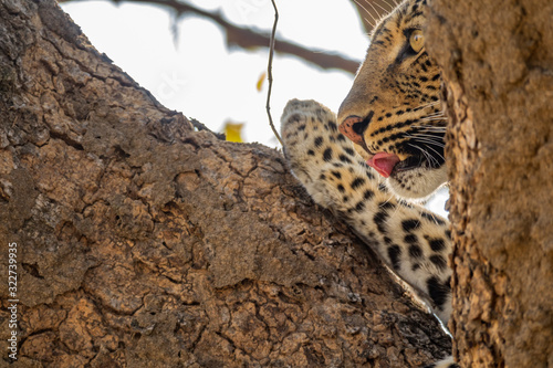 Leopard over the tree with tongue out