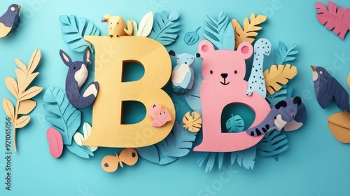 Letter B: Paper cut style illustration, colorful 3D whimsical, text "B" made of cute animals