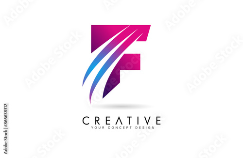 Letter F f Logo Design in purple blue colors with negative space Swooshes and creative font cut