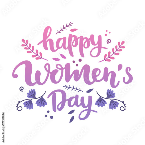 Lettering Happy Women's Day poster. Trendy calligraphy with plants, twigs, flowers. Vector illustration for typography. Print to party, sticker, banner, badge, design, flyer, web, advertising.