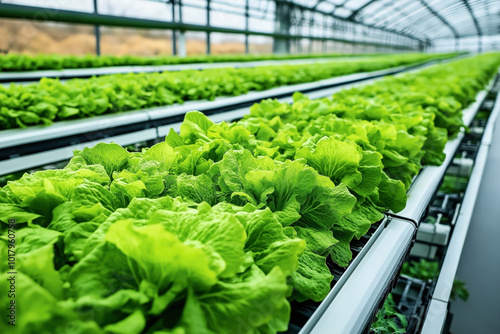 Lettuce plants growing in a hydroponic system inside a greenhouse with rows of vibrant green leaves under controlled agricultural conditions.