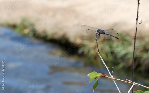 libélula en lago parada en una rama