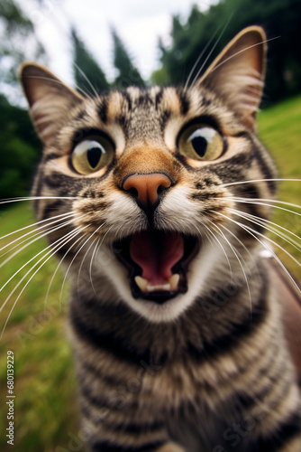 licking cat takes selfie, cute, fun, comic, realistic, low angle created with Generative Ai