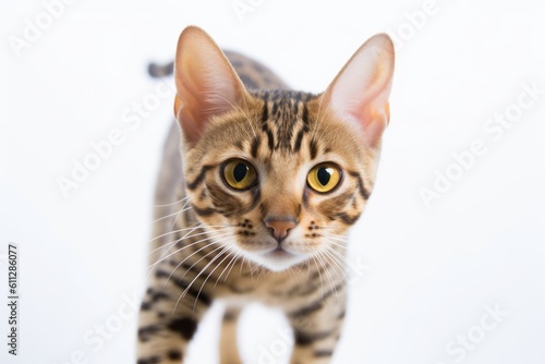 Lifestyle portrait photography of a cute ocicat climbing against a white background. With generative AI technology