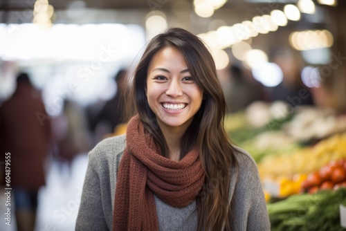 Lifestyle portrait photography of a grinning girl in her 30s wearing a cozy sweater against a bustling farmer's market background. With generative AI technology