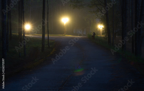 pine, starburst, lens flare, scene, blue, view, forest, travel, beautiful, black, lamp, winter, park, urban, fog, tree, background, road, nature, street, dark, landscape, light, night, junction
