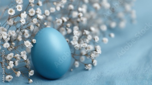 Light blue Easter egg nestled amongst delicate white flowers on a soft, light blue surface