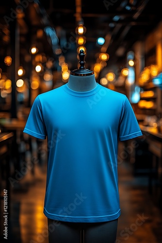 shirt, t-shirt, tee, apparel, clothing, fashion, style, garment, blue, light, colours, mannequin, display, store, shop, retail, indoor, lighting, dark, dim, background, bokeh, light, texture, fabric, cotton, casual attire, summer, spring, wear, man, male, model, front, view, blank, template, design, product, image, photo, showcase