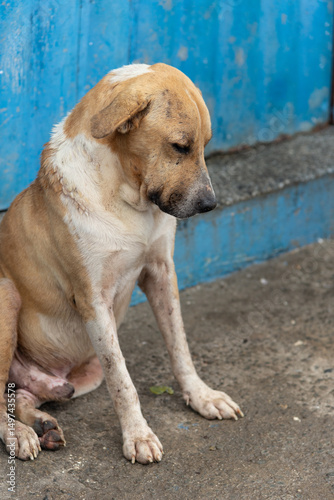 Light brown and white dog sitting on a street sidewalk with a tired or sick expression. Street animal.