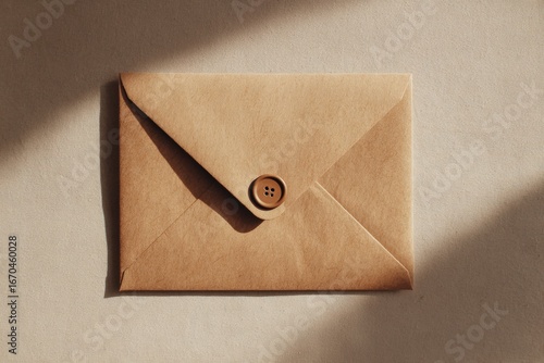 envelope, brown, paper, buttons, wooden, light, shadow, mail, letter, simple, minimalist, design, texture, surface, folded, sewn, craft, vintage, classic, neutral, warm, sunlight, still life, object, photo, detail, close, up, studio, aesthetic, natural, organic, beige, detail