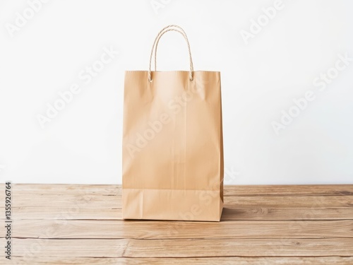 paper bag, shopping bag, light brown, beige, wooden table, wood, surface, copy space, 1, single, container, cardboard box, retail, blank, empty, studio shot, simple, minimal, neutral, calm, light, texture, natural, sustainable, presentation, background, still life, nobody, object, indoor, day, closeup