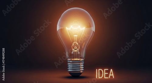 Light Bulb Idea Glowing on Brown Background, Clear Glass, Metal Base and Filament Design