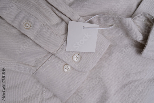 Light cotton shirt with a blank clothing price tag or label mockup. Ecology concept. Clothes sales concept
