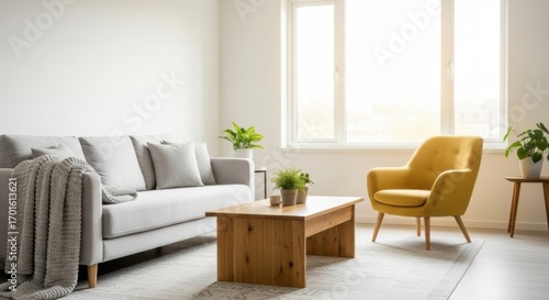 Light filled living room with grey sofa yellow armchair and wooden coffee table interior