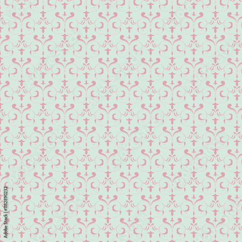 Light mint and pink ornamental damask seamless pattern. Decorative scroll design perfect for feminine backgrounds, wallpapers, textiles, and stationery.