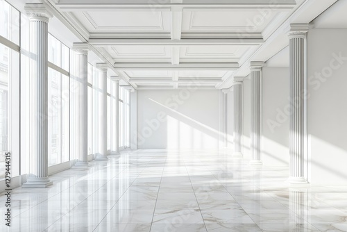 Light spacious presentation hall with columns and white walls. AI generated illustration.