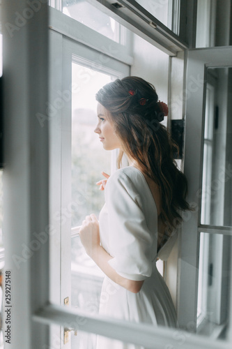 Light wedding photo shoot in the Museum. Beautiful bride in fine art Studio.