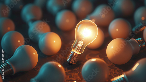 lightbulb shining brightly amid a collection of unlit lightbulbs,