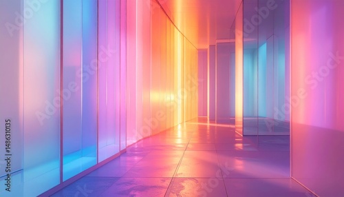 hallway, light, colours, vibrant, modern, abstract, architecture, building, interior, design, space, corridor, glow, aglow, pastel, pink, blue, orange, yellow, purple, geometry, line, perspective, clean, smooth, wall, floor, tile, bright, airy, artistic, dreamlike, aethereal, serene, peaceful, contemporary, futuristic, illusion, spectrum, gradient, refraction, prism, glasses, acrylic, surface, texture, pattern, vertical