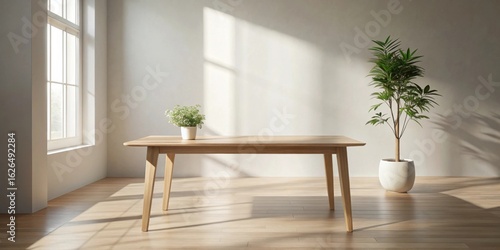 wooden table, hardwood floor, sunlight, minimal, simple, plant, greenery, interior design, home decor, modern, contemporary, natural light, bright, airy, clean, stylish, elegant, serene, calm, peaceful, comfortable, relaxing, room