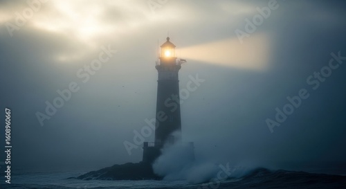 lighthouse, beacon, light, storm, sea, wave, fog, mist, sun, tower, guidance, hope, strong, powerful, nature, ocean, darkness, illumination, danger, safety, navigation, travel, journey, wind, rocky, shore, silhouette, dark, grey, dramatic, bright, intense, ray, cloud, sky, gold, calm, sharpened, strength, direction, security, hopeful, triumph, persistence, support, inspiration, courage, resilience, determination