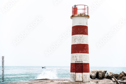 Lighthouse on seashore near sea