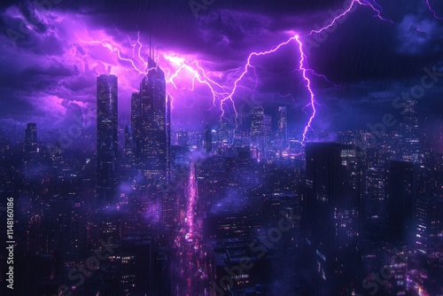 Lightning storm over city in purple light Lightning storm over city in purple light Lightning