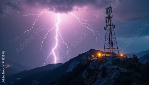 lightning, storm, mountain, tower, electricity, communication, thunder, night, weather, energy, strike, sky, cloud, power, nature, flash, transmitter, infrastructure, antennae, peak, dramatic, purple, landscape, dark, danger, climate, environment, electric, discharge, voltage, signal, transmission, connection, metal, structure, hillside, forest, light, glowing, scenery, phenomena, hazard, severe, natural, wild, high, altitude, telecom, technology