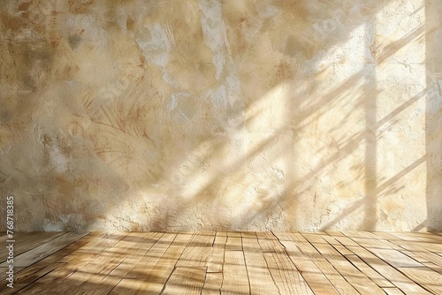 lightweight beige empty wall and wooden floor with interesting with glare from the window. Interior background