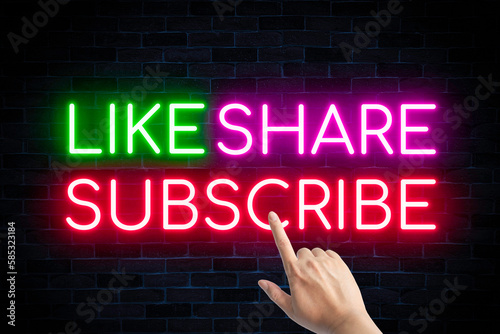 Like, share, subscribe neon banners on bricks wall backgrounds, light signboard followers, and social media content channels.