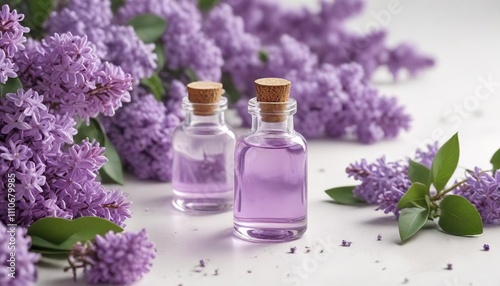 Lilac essential oil bottle surrounded by lilac blossoms on white background, freshness, health
