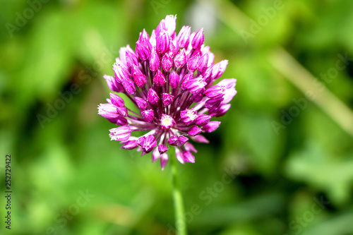 Lilac flower of garlic, close-up. Grows in the garden.